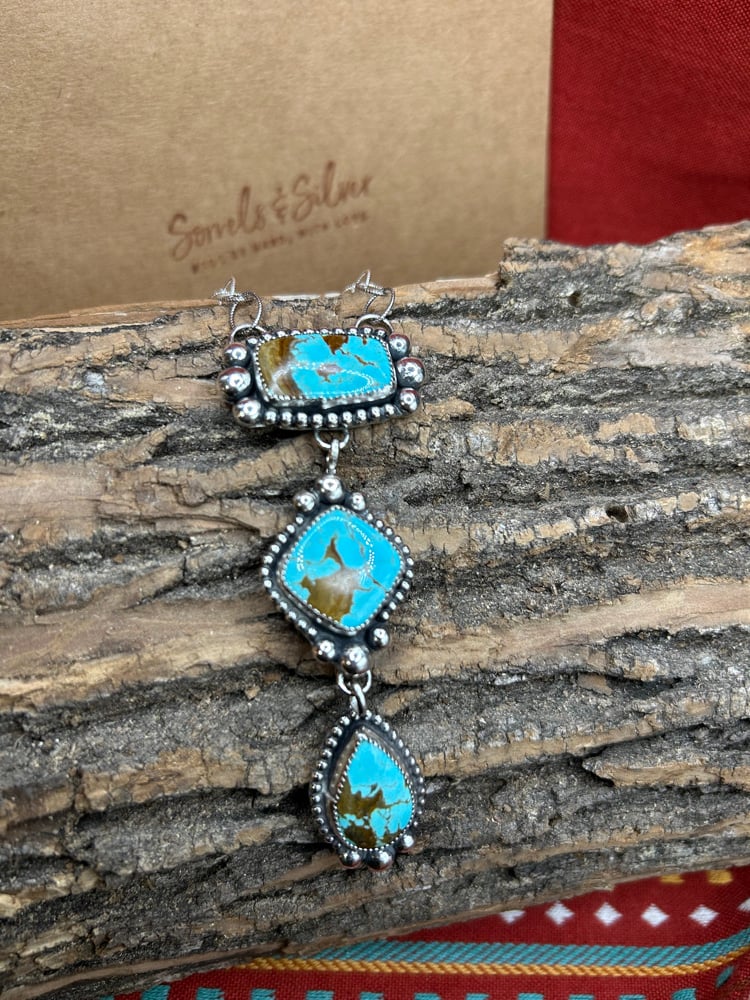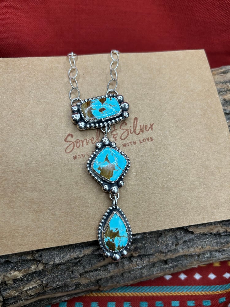 #8 Mine Turquoise necklace, surrounded by sterling silver, with fine silver bezels. 18” textured sterling silver chain.