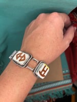 Ceramic Brands cut from a vintage plate, surrounded by sterling silver with fine silver bezels. 8” total length with handmade sterling chain