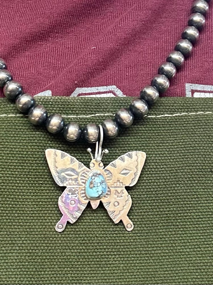Golden Hills turquoise on a sterling butterfly pin comes with a sterling adaptor so it can be worn as a pendant or a brooch, stamped by artist