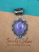 Beautiful purple Chariote stone set in sterling silver, with sterling embellishments and a fine silver bezel, 10mm bail