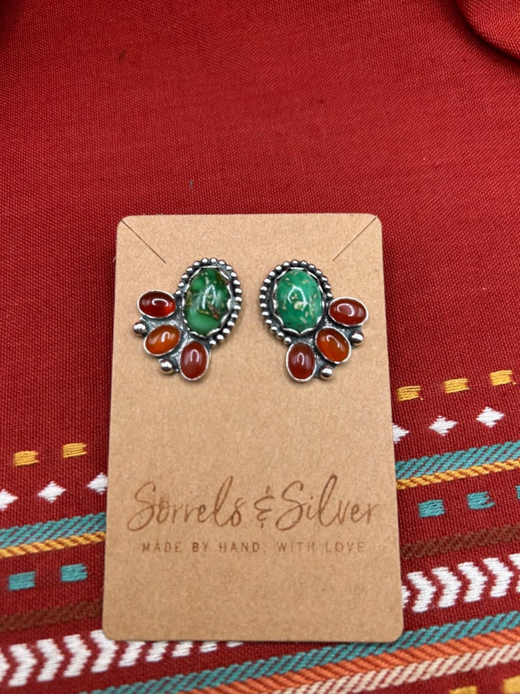 Emeral Valley Turquoise and Carnelian stud earrings, sterling silver with fine silver bezels