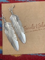 Native made and stamped feather dangles, satin finish, 3.5” total length