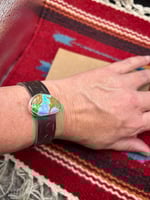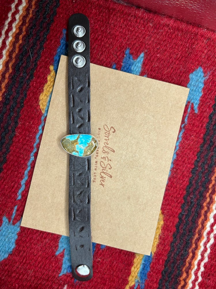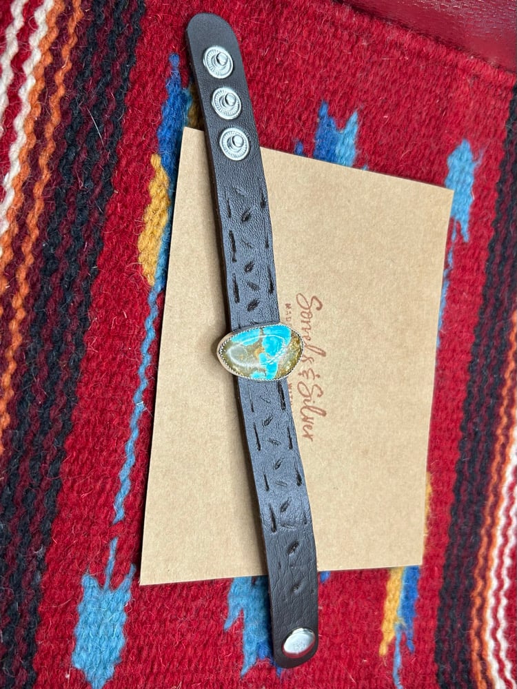 Adjustable leather band, genuine turquoise set in sterling silver with fine silver bezel