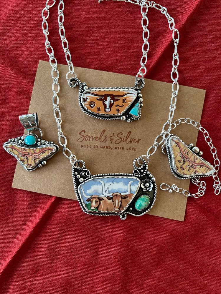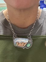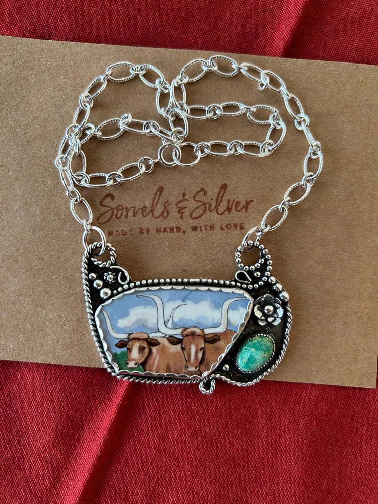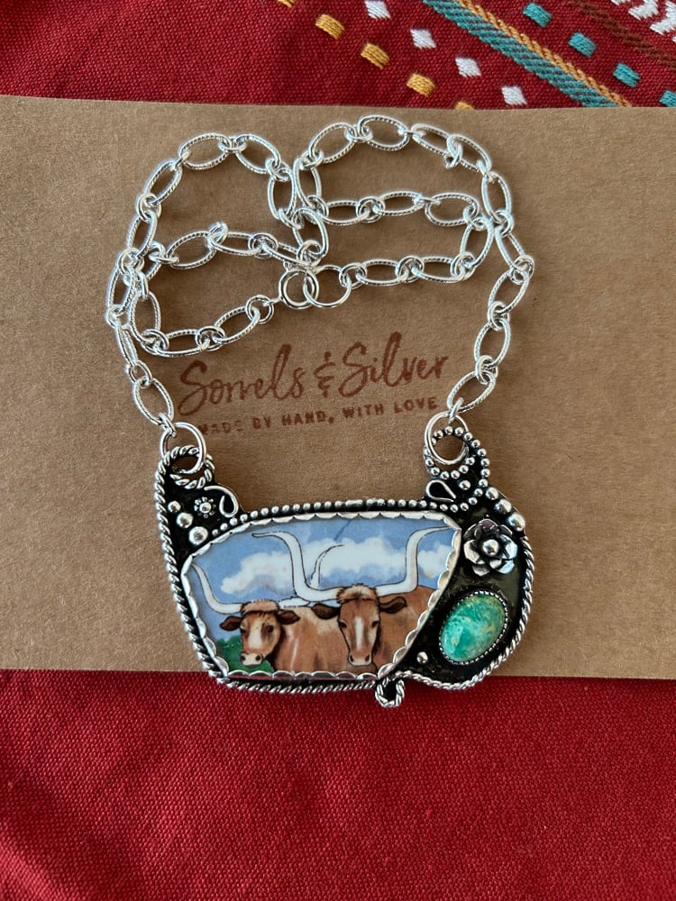 Ceramic Longhorn and Emerald Valley Turquoise set in sterling silver with fine silver bezels. 16” sterling chain