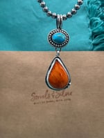 This pendant features a Kingman Turquoise stone with a large orange Spiny Oyster dangle, set in sterling silver with fine silver bezels, on 7mm bail (shown with 5mm pearls not included)