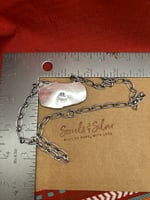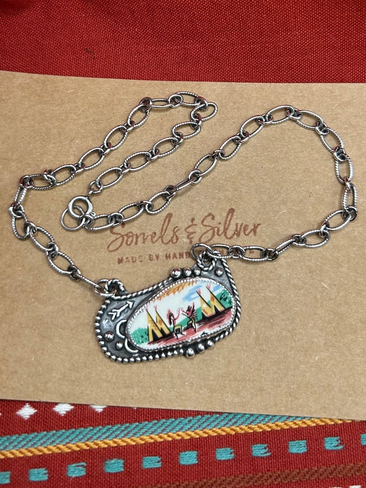 Hand cut ceramic piece set in solid sterling silver with a fine silver bezel and sterling embellishments. 16” oxidized sterling chain