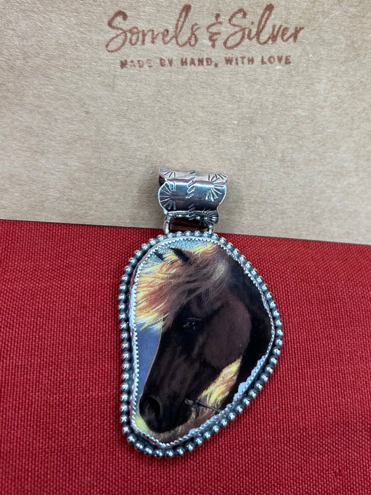 This is a big chestnut horse is surrounded by sterling silver, with a fine silver bezel, on a 10mm handmade bail